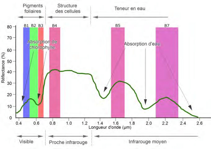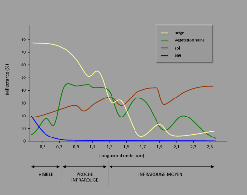 Toutes les surfaces ne réfléchissent pas la lumière de la même manière, ce qui fait qu’il est possible de reconnaitre différents grands types de profil de réflectance : la végétation, l’eau, la terre…
