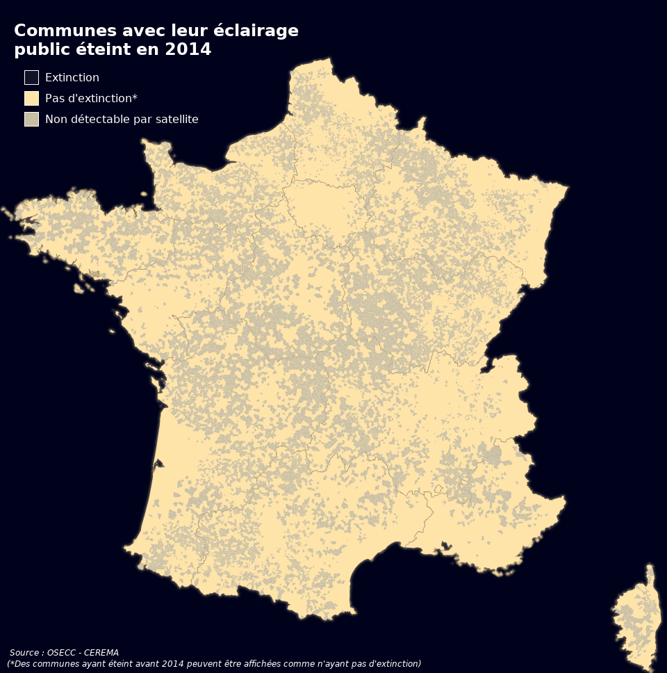 Cette carte permet d’observer l’évolution dans le temps des pratiques d’éclairage public de plus de 19 000 communes de l’Hexagone depuis 2014. Les données référencent les pratiques d’extinctions totales, partielles et les rénovations d'ampleur du parc d’éclairage. Elles permettent de constater la mise en place, la poursuite ou l’arrêt de politique d'extinction en cœur de nuit.
